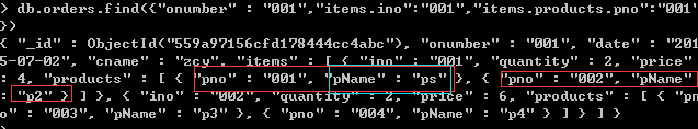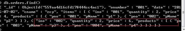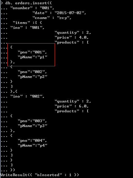 >db. orders.insert({ "onumber" : "001", "date" : "2015-07-02", "cname" :"zcy", "items" :[ { "ino" : "001", "quantity": 2, "price" : 4.0, "products" : [ { "pno":"001", "pName":"p1" }, { "pno":"002", "pName":"p2" } ] } ] })