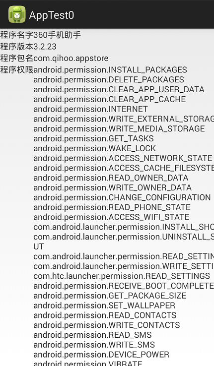 <?xml version="1.0" encoding="utf-8"?> <LinearLayout xmlns:android="http://schemas.android.com/apk/res/android" android:orientation="vertical" android:layout_width="fill_parent" android:layout_height="fill_parent" > <TableLayout android:id="@+id/app_table" android:layout_width="fill_parent" android:layout_height="wrap_content"> <TableRow android:id="@+id/tableRow1" android:layout_width="wrap_content" android:layout_height="wrap_content" > <TextView android:layout_width="wrap_content" android:layout_height="wrap_content" android:text="程序名字" /> <TextView android:layout_width="wrap_content" android:layout_height="wrap_content" android:id="@+id/detail_app_name" /> </TableRow> <TableRow android:id="@+id/tableRow2" android:layout_width="wrap_content" android:layout_height="wrap_content"> <TextView android:layout_width="wrap_content" android:layout_height="wrap_content" android:text="程序版本号" /> <TextView android:layout_width="wrap_content" android:layout_height="wrap_content" android:id="@+id/detail_app_version" /> </TableRow> <TableRow android:id="@+id/tableRow3" android:layout_width="wrap_content" android:layout_height="wrap_content"> <TextView android:layout_width="wrap_content" android:layout_height="wrap_content" android:text="程序包名" /> <TextView android:layout_width="wrap_content" android:layout_height="wrap_content" android:id="@+id/detail_app_packname" /> </TableRow> <TableRow android:id="@+id/tableRow4" android:layout_width="wrap_content" android:layout_height="wrap_content"> <TextView android:layout_width="wrap_content" android:layout_height="wrap_content" android:text="程序权限" /> <TextView android:layout_width="wrap_content" android:layout_height="wrap_content" android:id="@+id/detail_app_permissions" /> </TableRow> </TableLayout> </LinearLayout>
