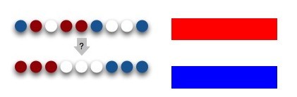 现有红白蓝三个不同颜色的小球,乱序排列在一起。又一次排列这些小球。使得红白蓝三色的同颜色的球在一起。