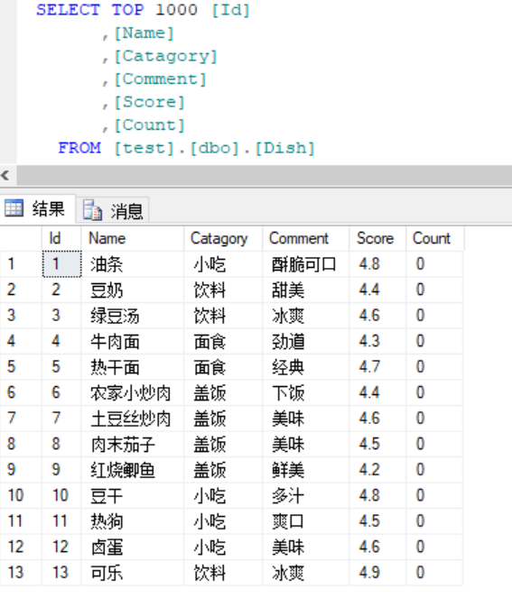 class Dish { public int Id { get; set; } public string Name { get; set; } public string Catagory { get; set; } public string Comment { get; set; } public double Score { get; set; } public int Count { get; set; } }