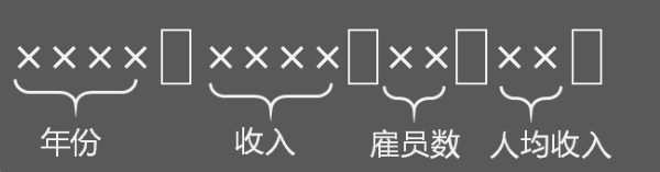 ① 补全程序,实现题目要求,把年份、收入、雇员人数、人均收入,以结构化方式写入table段中。