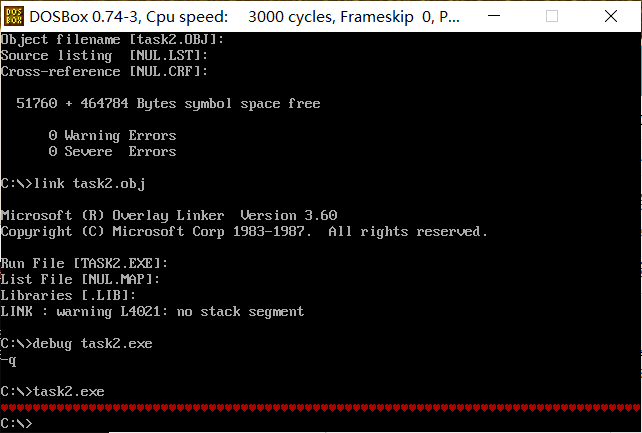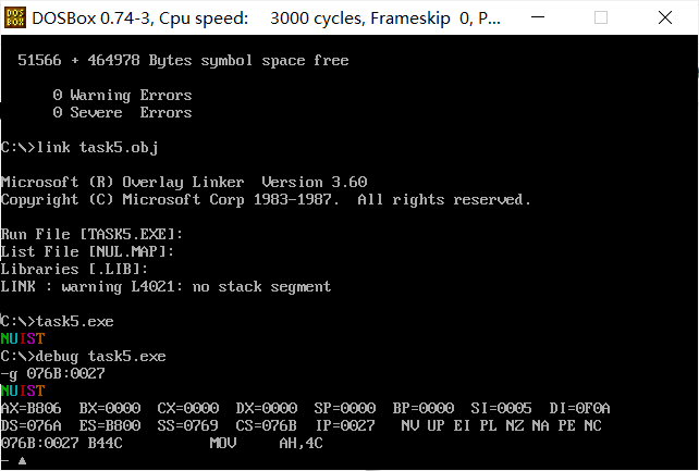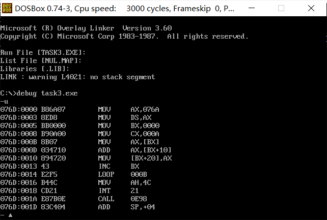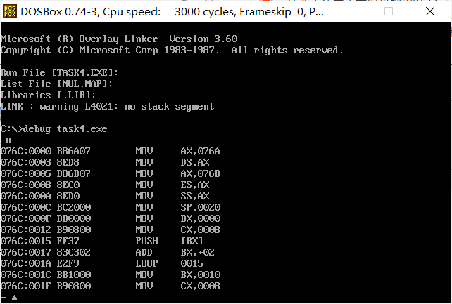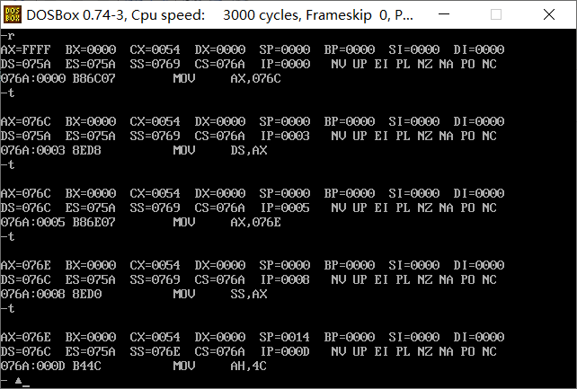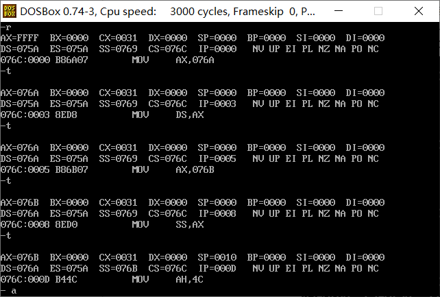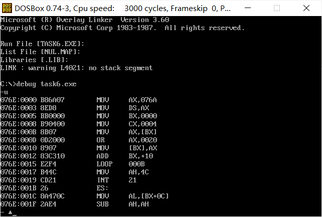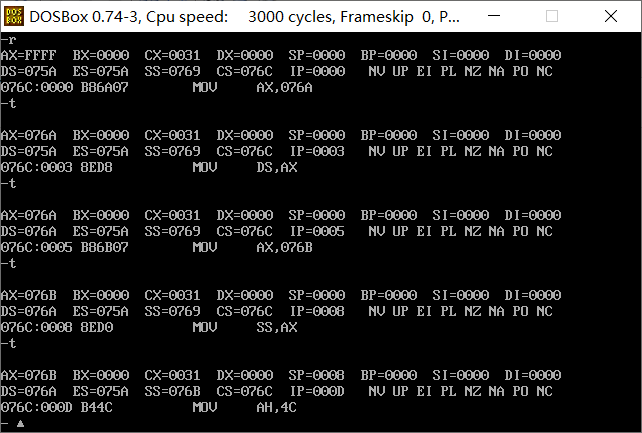 assume ds:data, cs:code, ss:stack code segment start: mov ax, data mov ds, ax mov ax, stack mov ss, ax mov sp, 20 mov ah, 4ch int 21h code ends data segment db 20 dup(0) data ends stack segment db 20 dup(0) stack ends end start