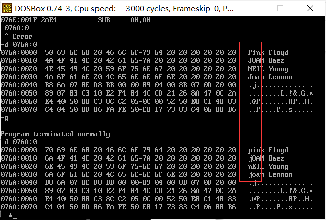 assume cs:code, ds:data data segment db 'Pink Floyd ' db 'JOAN Baez ' db 'NEIL Young ' db 'Joan Lennon ' data ends code segment start: mov ax, data mov ds, ax mov bx, 0 mov cx, 4 s: mov ax, [bx] or ax, 20h mov [bx], ax add bx, 16 loop s mov ah, 4ch int 21h code ends end start