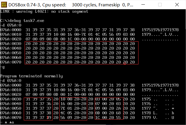② 在debug中加载程序,反汇编,执行到line13退出前,用d命令查看data段对应的内存空间,确认每