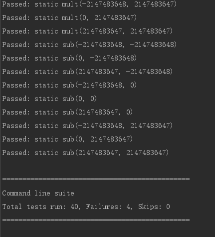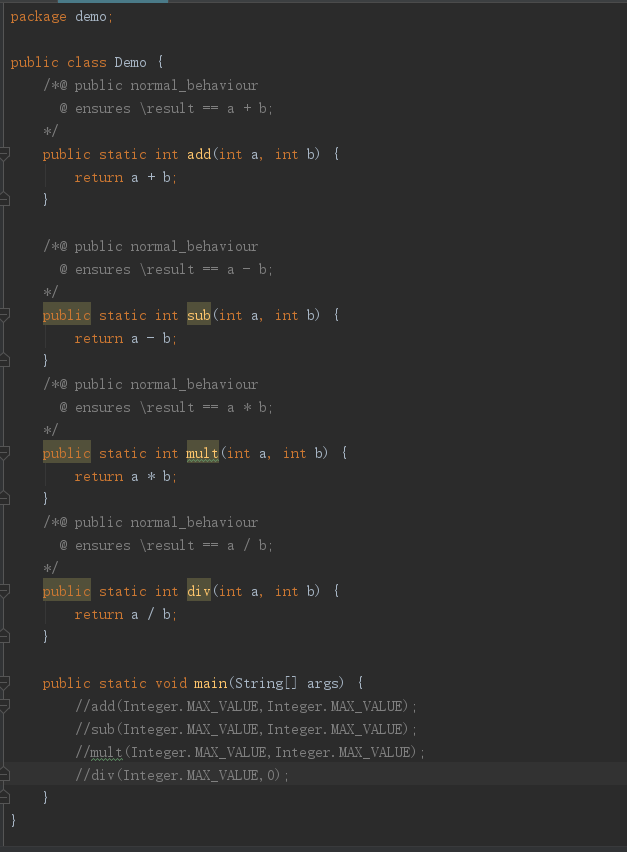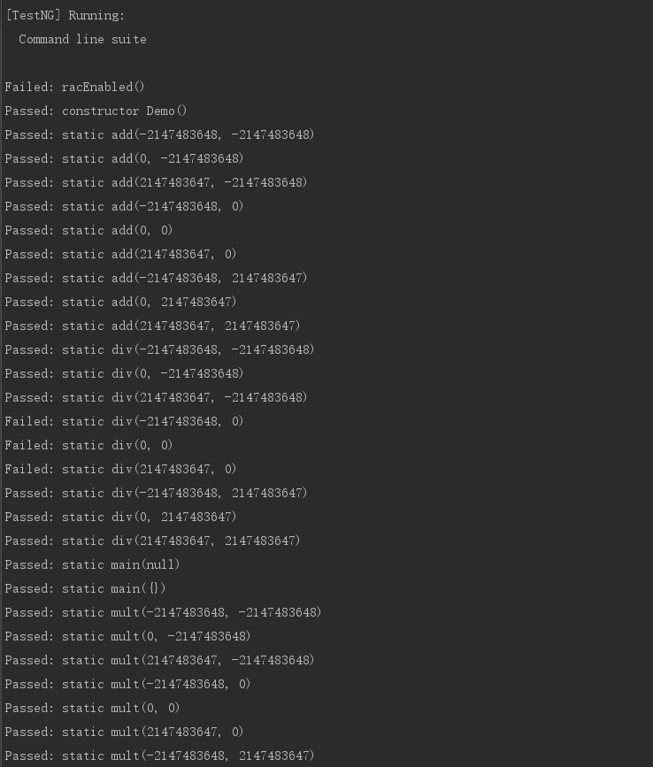 可以看出,Jmlunitng主要用int范围的临界值,来生成测试样例。在div方法中,有潜在除于0的风险,被自动测试测出。从Jmlunitng生成的测试数据来看,其仍有改进的地方。