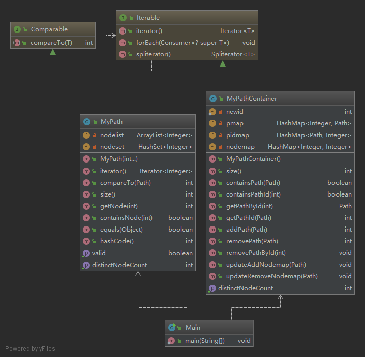 第一次作业主要涉及路径容器的基本操作,实现增删查等功能。具体实现是:MyPath用一个ArrayList和HashSet来存储Path的结点。ArrayList用于返回迭代器,getNode操作;HashSet用于containsNode操作。MyPathContainer用两个HashMap(pidmap,pmap)来存储Path,分别用PathId和Path作为键,原因是HashMap在增删查方面的时间复杂度都比较低,这里采用了以空间换时间的设计。第一次作业比较简单,按照JML规格来写代码,基本没什么问题。