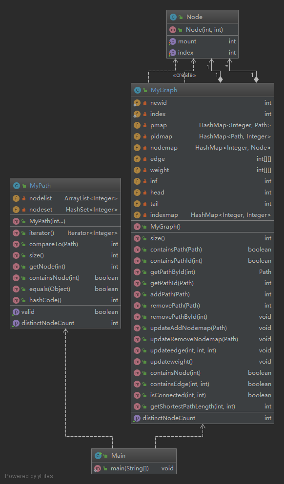 第二次作业由PathContainer扩展为Graph,增加了一些关于图的基本概念与算法——是否包含某条边(containsEdge)、两个节点是否连接(isConnected)和计算两个节点的最短路径(getShortestPathLength)。涉及到图,首先考虑图如何存储,因为在任何时候总结点个数都不超过250个,所以可以采用邻接矩阵的方式存储(需要建立节点和邻接矩阵下标之间的映射关系)。根据节点和邻接矩阵下标的对应关系,就能够判断某条边是否存在。图的最短路径算法有Dijkstra求单源最短路径、BFS广度优先寻找最短路径和Floy求多源点最短路径。考虑到图变更的指令最多只有20条,因此只要在变更时跑一遍Floyd,之后的查询时间复杂度是O(1),而且能根据Floyd的结果判断两个节点是否连通。这样下来,整体的时间复杂度并不高。