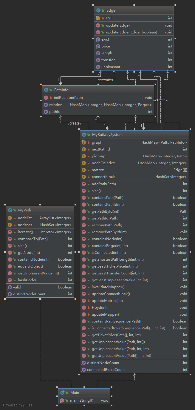 第三次作业在第二次作业基础上实现RailwaySystem,新增了计算无向图连通块的数目,两个节点之间的最低票价、最少换乘次数和最小不满意度。这次作业我认为较难的就是对换乘的处理,最后的解决方案是先对每个Path中的任意两点求出三个最优解(最低票价、最少换乘和最少不满意度)此时不需要换乘;然后遍历所有的Path,对具有相同起点和终点的最优解进行刷新,放入邻接矩阵中;最后邻接矩阵的具有相同起点和终点的最优解进行刷新,此时可能需要换乘。由于第二次作业的扩展性比较差,因此我进行了重构设计,新建一个Edge类,其数据成员有exist(边的存在性),length(两个节点的最短距离),transfer(两点的最少换乘),price(两点的最低票价),unpleasent(两点的最少不满意度);新建一个PathInfo类,存放路径的Id和每个Path中任意两个节点之间Edge的信息;MyRailwaySystem类中用HashMap(graph)来存储路径,其key是Path,Value是PathInfo。只需对邻接矩阵matrex(其元素是Edge),用一次Floyd算法,就能计算出三个最优解。节点之间的连通性计算出来之后,遍历所有节点,把能连通的放到一个集合,集合的个数就是连通块的数量。