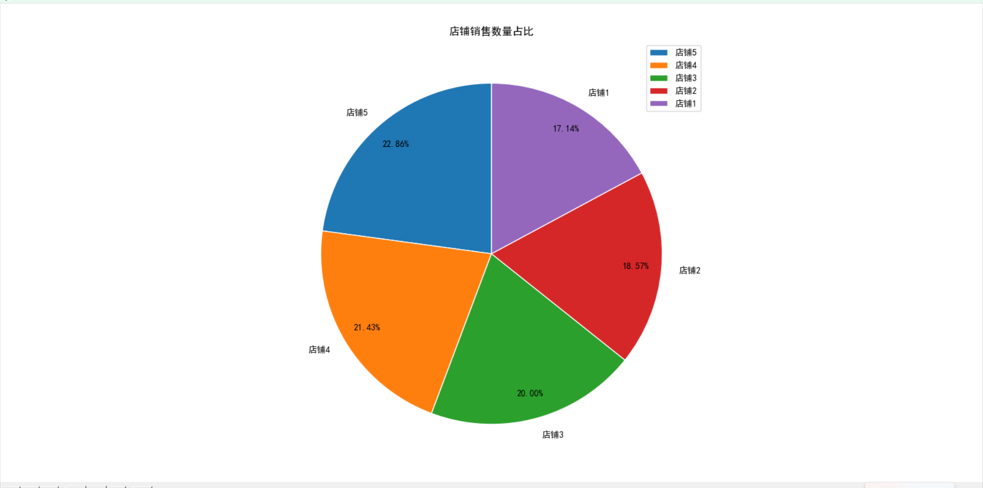 这段代码使用plt.pie函数绘制饼图。传入的参数包括聚合后的销售数量数据和店铺名称,以及一些设置如起始角度、扇形边框样式和百分比标签等。