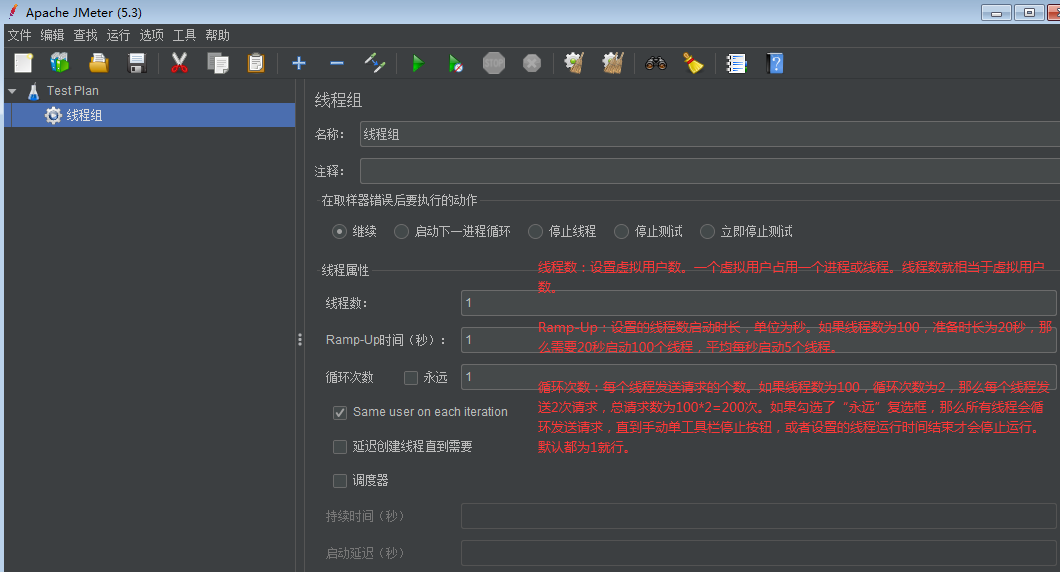 循环次数:每个线程发送请求的个数。如果线程数为100,循环次数为2,那么每个线程发送2次请求,总请求数为100*2=200次。如果勾选了“永远”复选框,那么所有线程会循环发送请求,直到手动单工具栏停止按钮,或者设置的线程运行时间结束才会停止运行