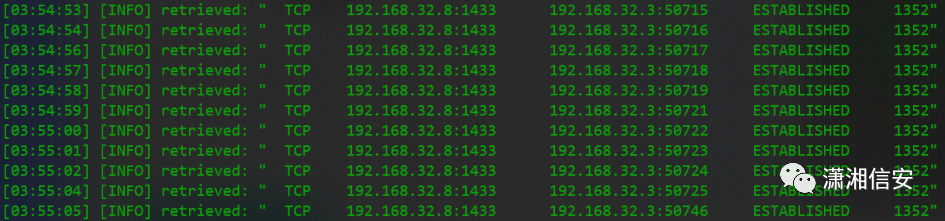 通过Netstat命令查看MSSQL数据库1433端口的网络连接状态,可以看到与当前MSSQL数据库服务器192.168.32.8建立连接的只有192.168.32.3,由此可以判断这台主机为Web服务器。