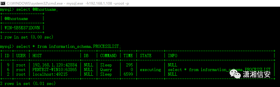 通过MySQL的@@hostname内置函数可以查看服务端主机名称,information_schema内置库的PROCESSLIST可以定位到当前已连接数据库的用户名、主机和端口号等信息,Windows连接格式:主机名:Port,Linux连接格式:IP:Port,本地连接格式:localhost:Port。