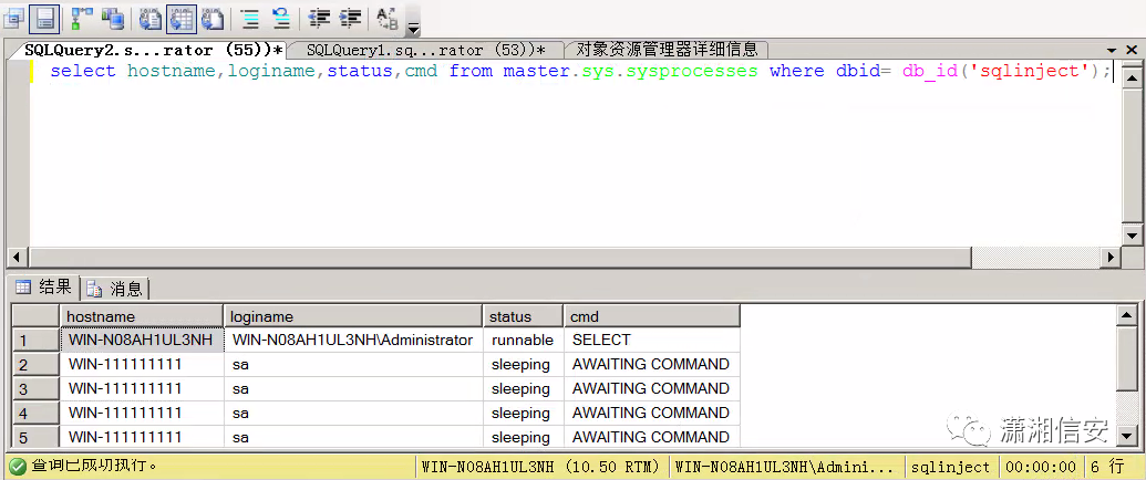 也可以通过MSSQL的sysprocesses系统表来判断是否站库分离,它的功能类似于MySQL中的PROCESSLIST,可以定位到当前已连接到sqlinject数据库的用户名和主机名等信息。