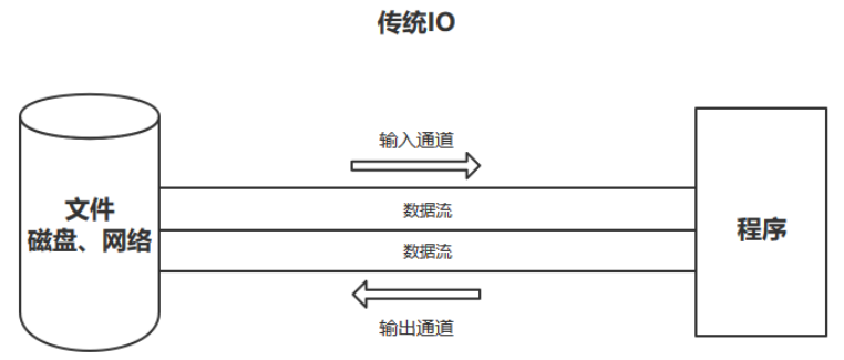 传统IO在传输数据时,根据输入输出的不同需要分别建立不同的链接,而且传输的数据是以流的形式在链接上进行传输的。