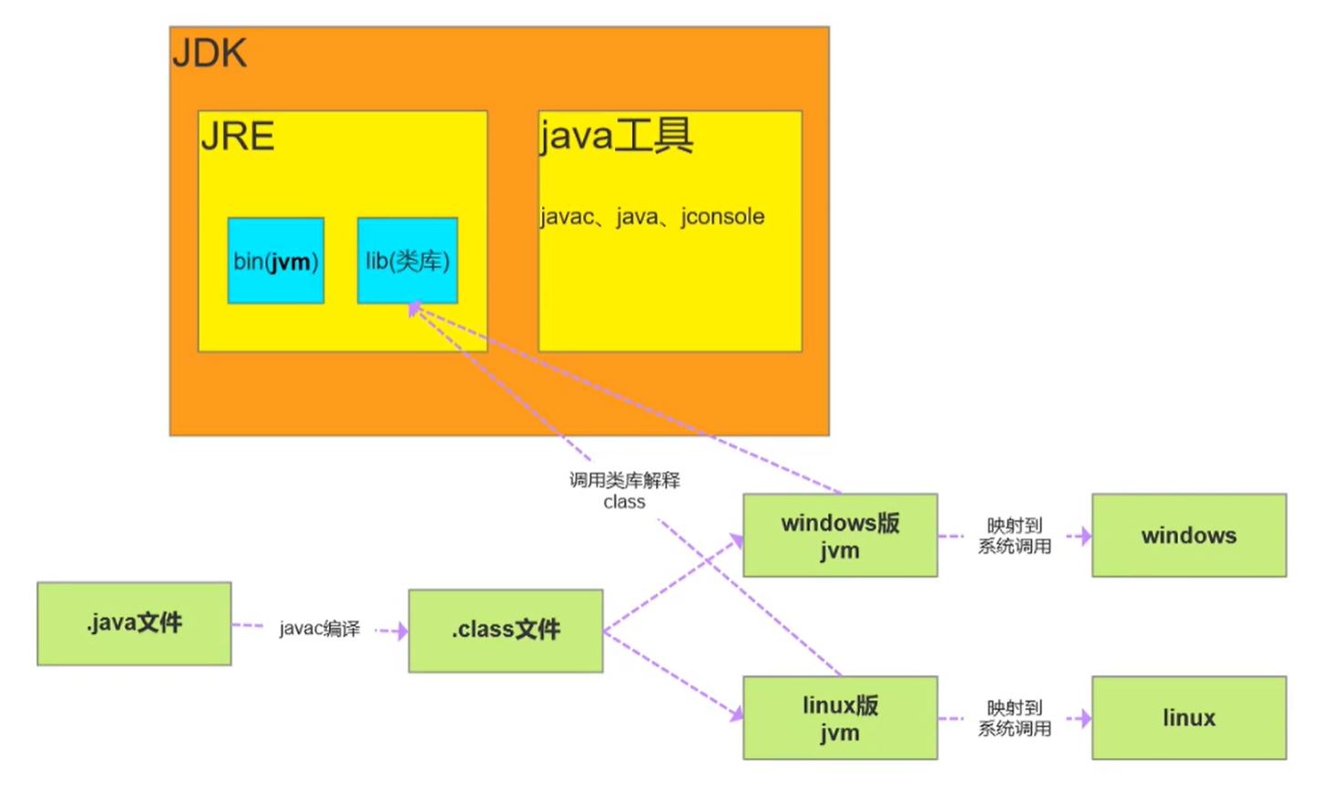 Java是跨平台的,通过javac编译的.class文件可以“到处运行”,.class文件再由JVM进行解释。