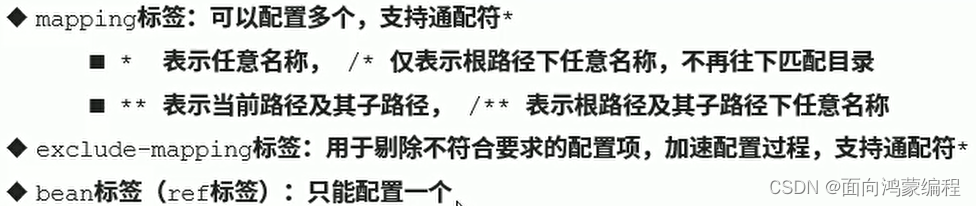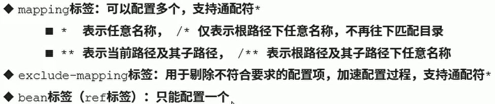我们通常可以将<mvc:mapping> 和 <mvc:exclude-mapping> 一起用,即先全部包含,然后再排除一部分。