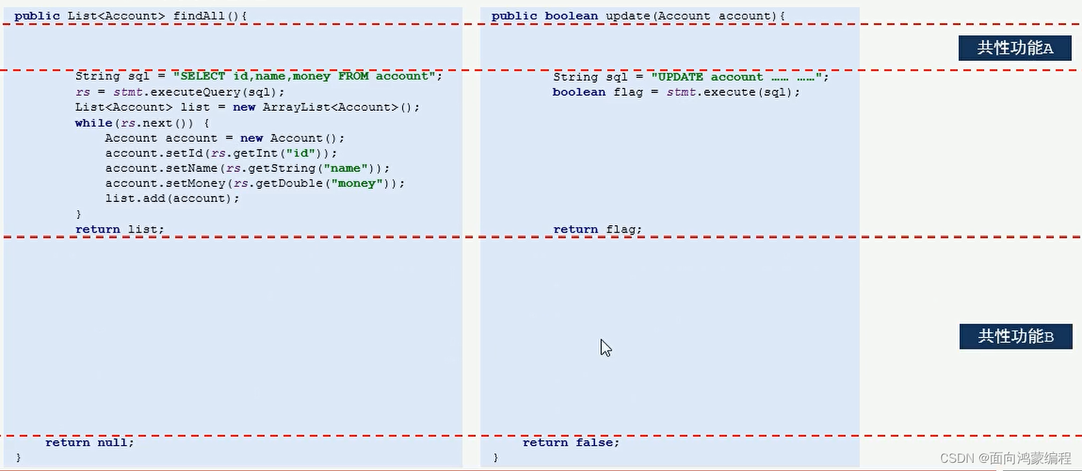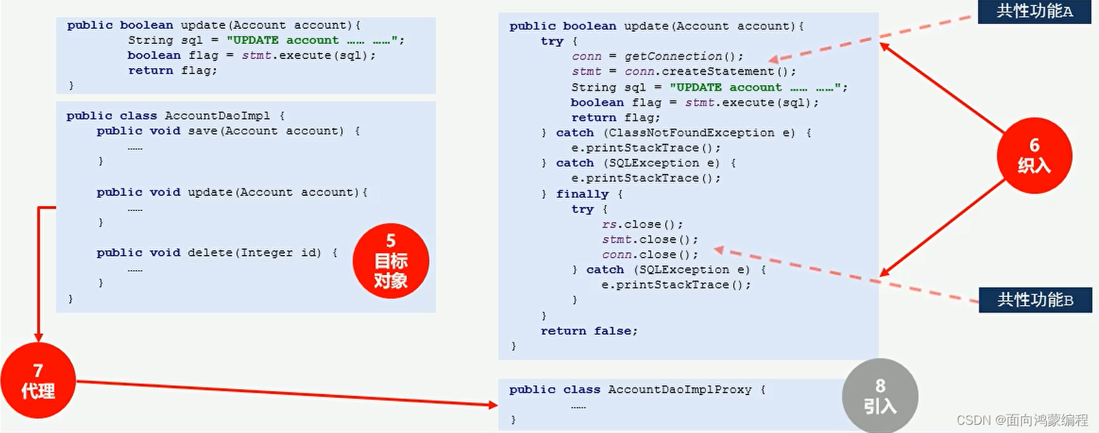 例如下述代码,我们可以从中抽取出共性的代码,使用AOP,在运行的时候,再将该环境还给对象。