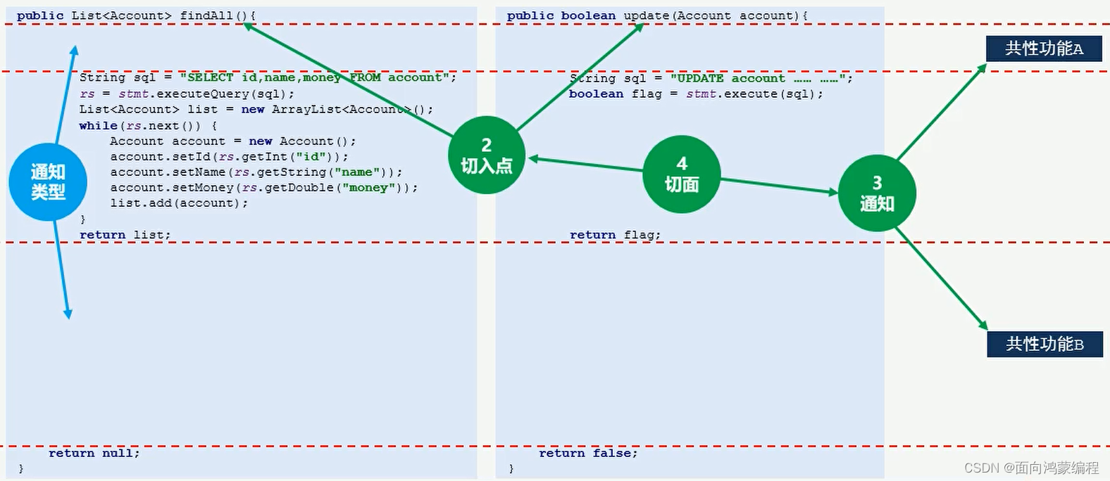 -  AOP程序开发主要关注基于OOP开发中的共性功能,一切围绕共性功能进行,完成某个任务先构建可能遇到的所有共性功能(当所有功能都开发出来也就没有共性与非共性之分)