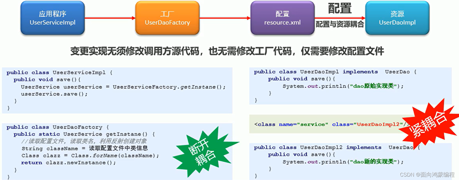 这是因为,如果类之间有耦合,那么修改之后要重新编译、打包、发布;而配置文件的变更,就只要将该文件发送到服务器即可。