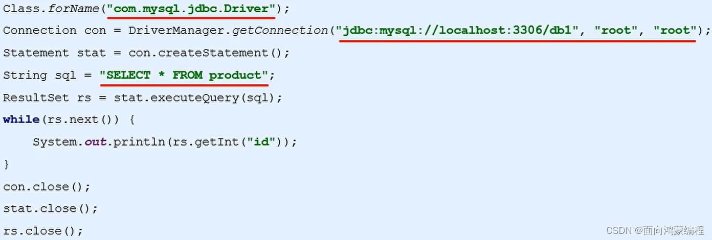 例如下述案例,是JDBC的示例代码,它可以实现数据库的查询product表的操作。