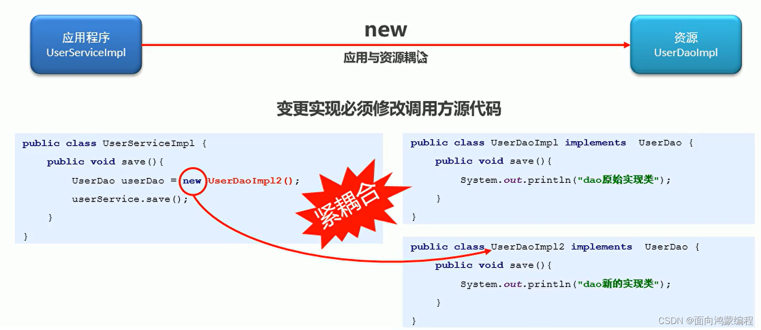 在业务层中new了一个数据层UserDaoImp1的实现类,但是这个时候,我们又有了一个UserDaoImp2,我们想修改业务层,让业务层new一个UserDaoImp2的实现类。
