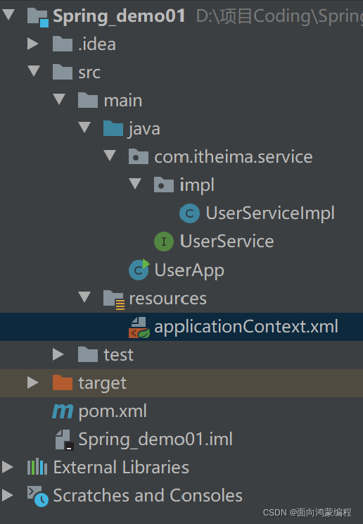 案例的结构如下,注意UserService接口里面时空的!什么都没有,本案例只是为了研究bean的创建、销毁时是怎样执行工作的?
