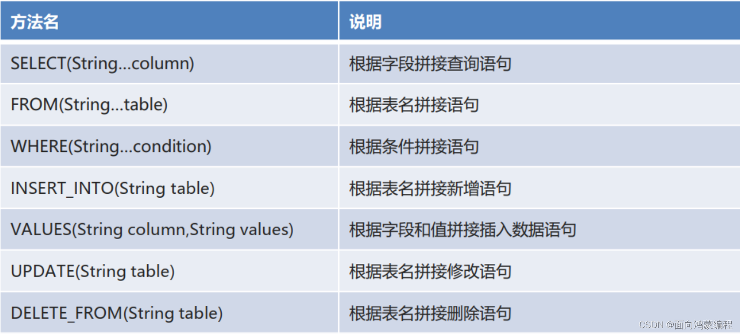 MyBatis 给我们提供了 org.apache.ibatis.jdbc.SQL 功能类,专门用于构建 SQL 语句。
