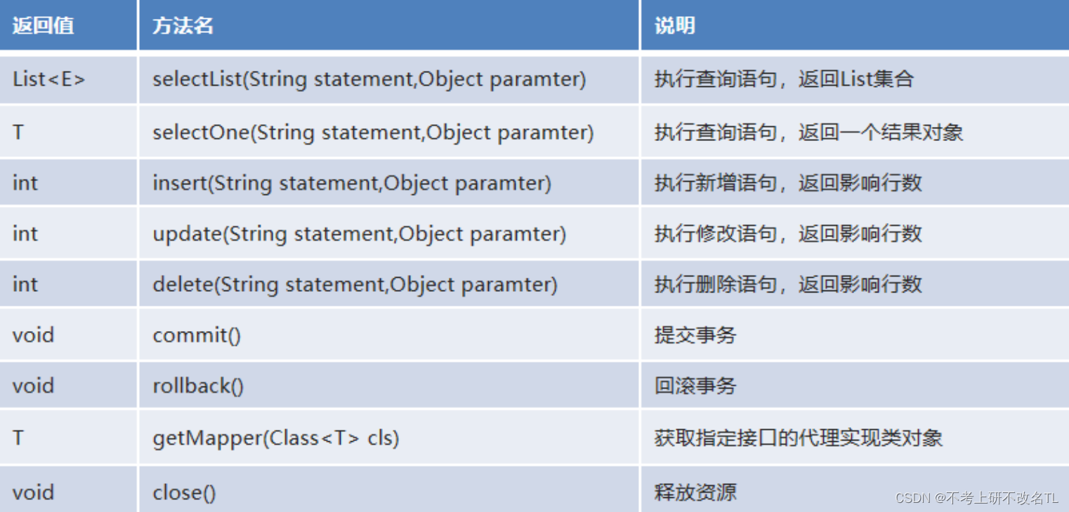 SqlSession 实例在 MyBatis 中是非常强大的一个类。在这里你会看到所有执行语句、提交或回滚事务和获取映射器实例的方法。