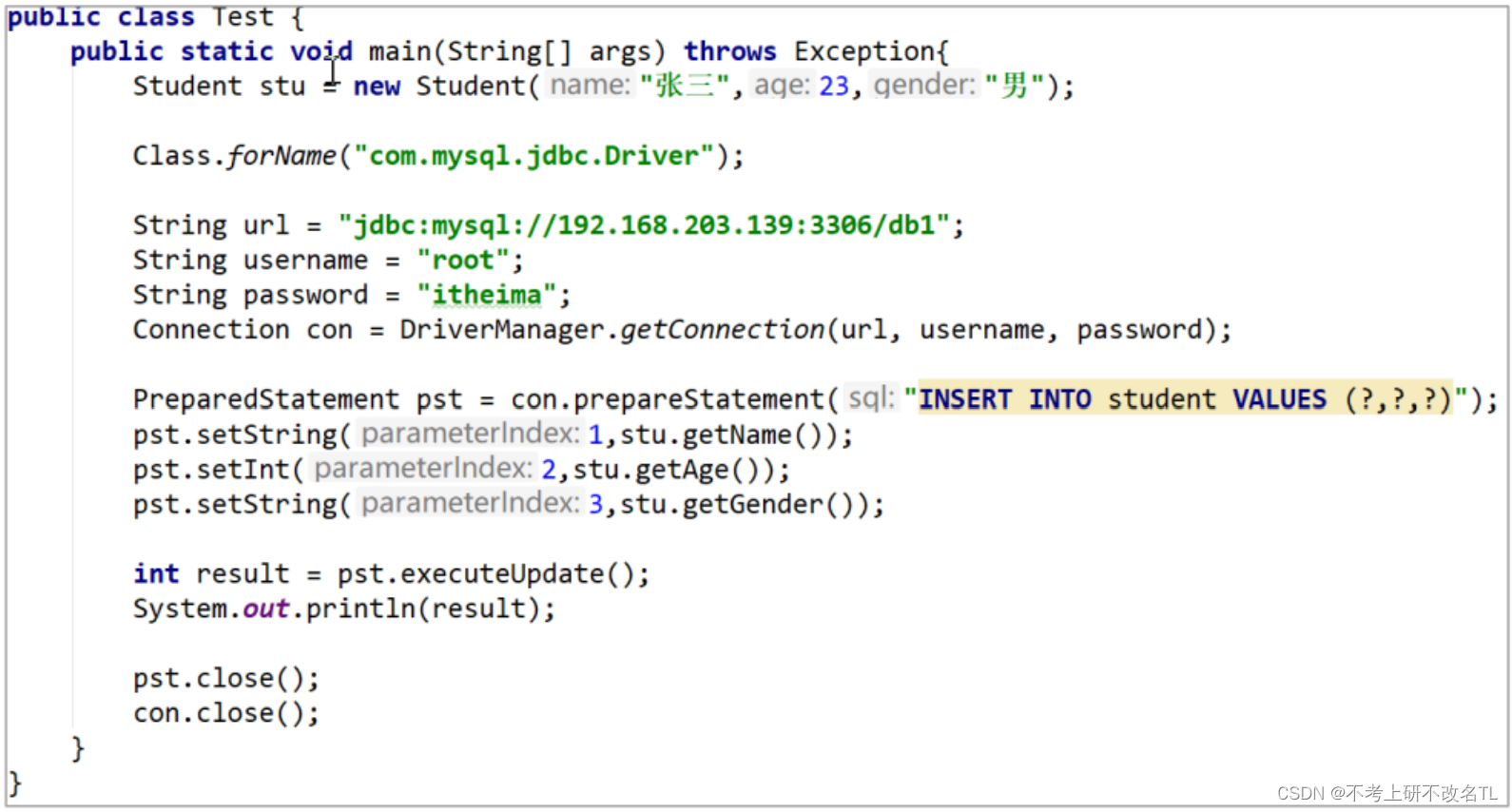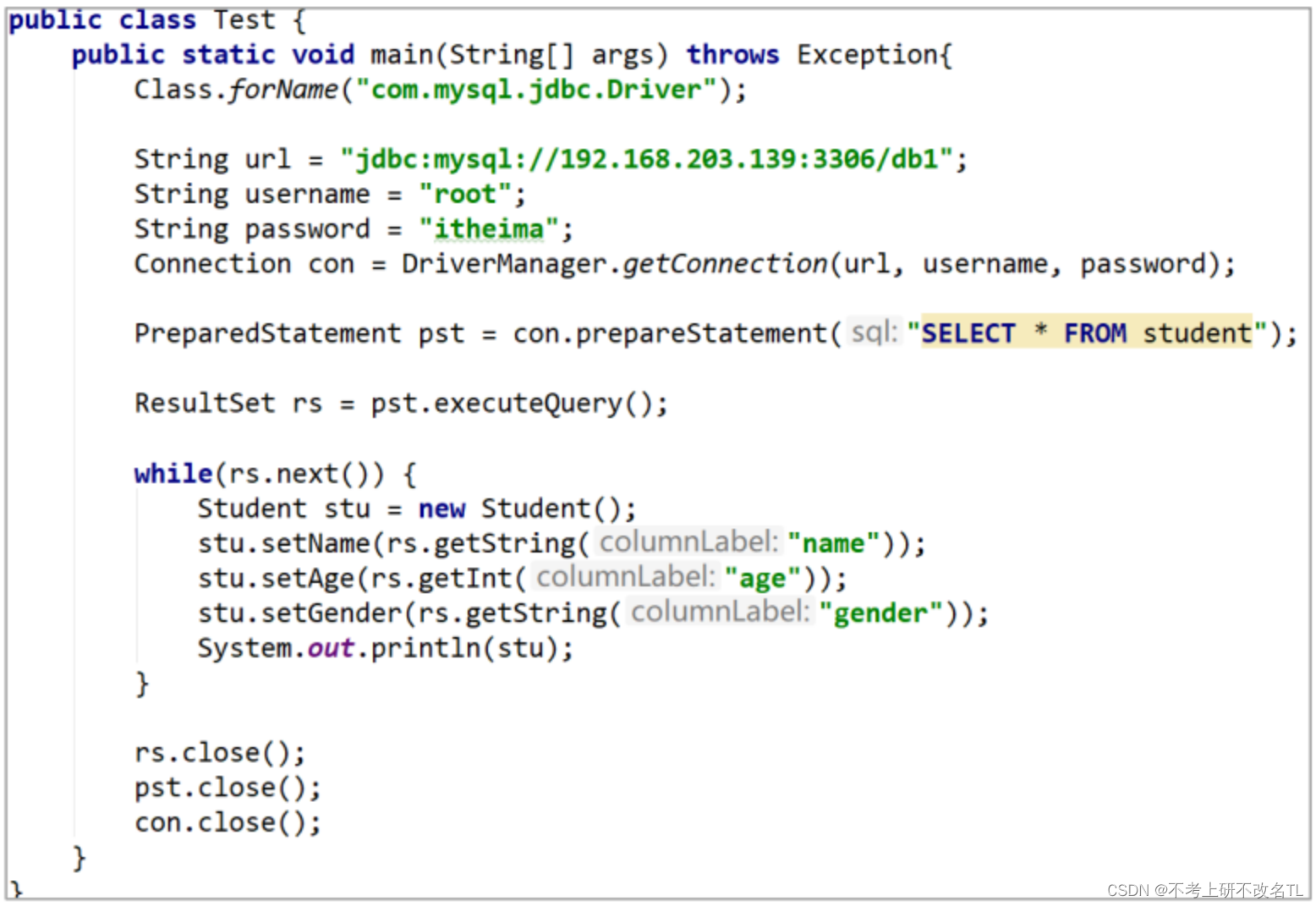 我们先回想一下在此之前我们是怎么对数据库操作的?当然是JDBC!代码样式如下: