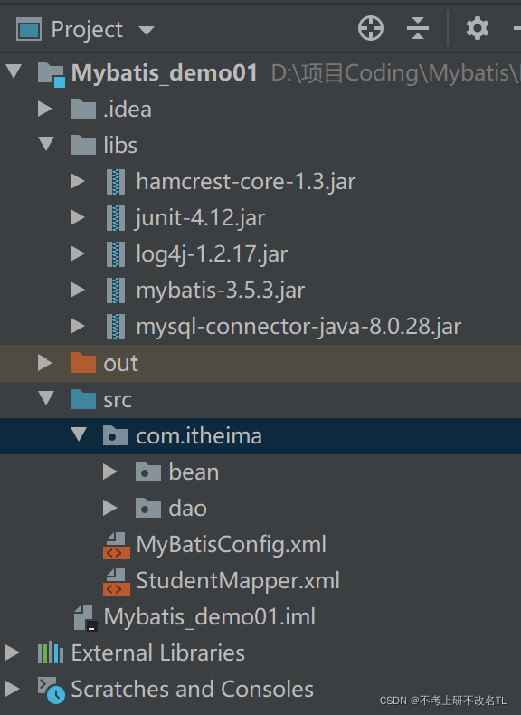 - 在核心配置文件MyBatisConfig.xml中定义了关系mysql连接的一些参数,在mappers标签中加载了映射配置文件StudentMapper.xml。