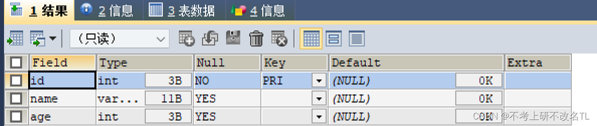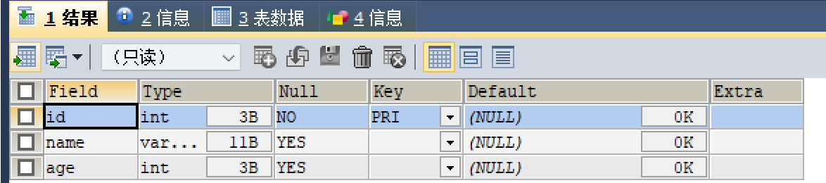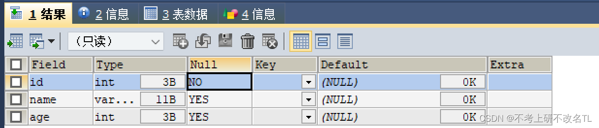 上述Null的那一列,在id行的值为“NO”,表示不能为空!在KEY的那一列的值为PRI表示主键。