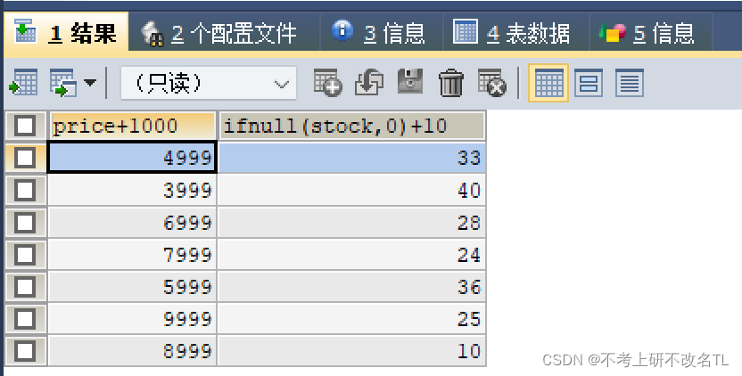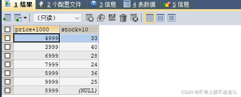 SELECT price+1000 AS price_new,IFNULL(stock,0)+10 AS stock_new FROM product;