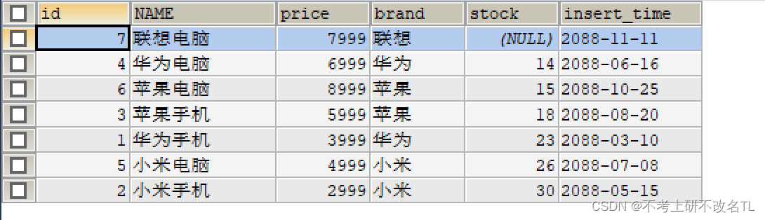 (7,'联想电脑',7999,'联想',NULL,'2088-11-11');