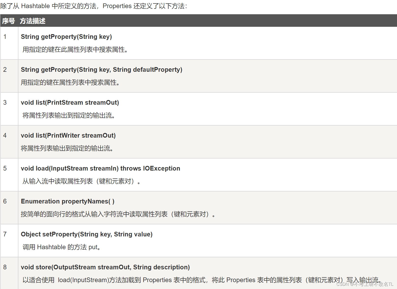 | Set<String> stringPropertyNames() | 从该属性列表中返回一个不可修改的键集,其中键及其对应的值是字符串 |