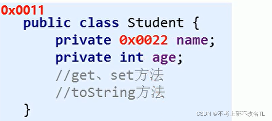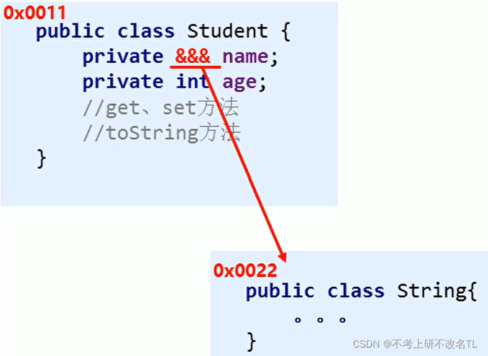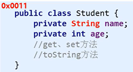 如下案例,有一个Student对象,要将其加载到内存,地址值假设为0x0011,String是一个引用数据类型