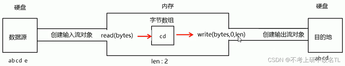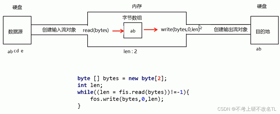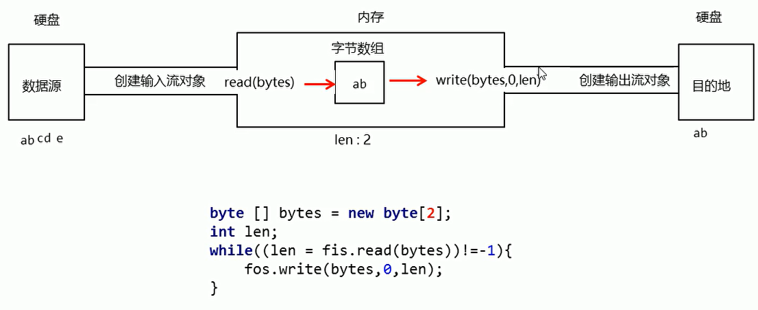 我们可以举一个例子来说明,假设byte数组的大小是2,数据源有abcde,则每次读入两个字符,这里第一次读入的是ab
