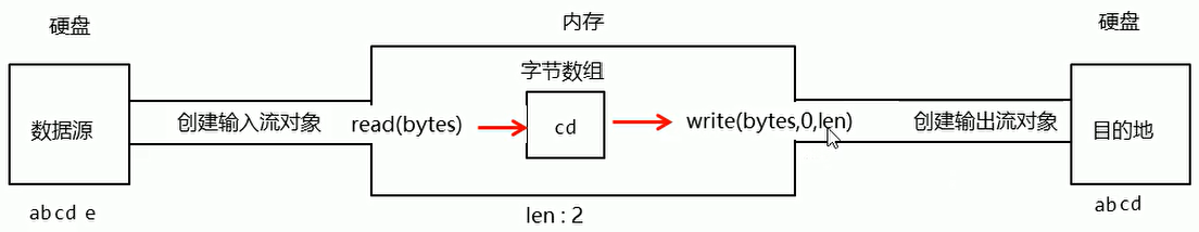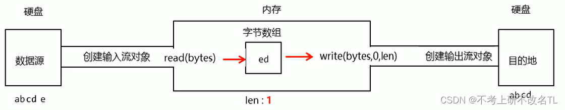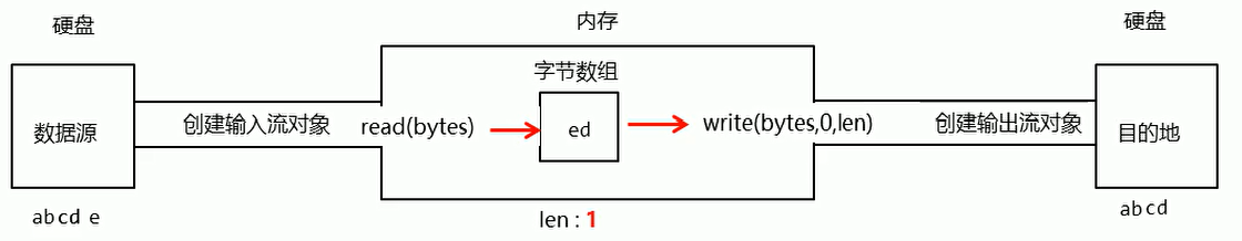 最后一次,因为只剩下一个e,所以读入后字符数组中的值为ed,len长度为1,但是不影响,在write(bytes,0,len),表示输出长度为len = 1 的。