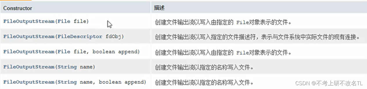 我们常用的是第一个和第四个构造,但其实他们的意思是一样的,都是将路径地址传递给FileOutputStream。