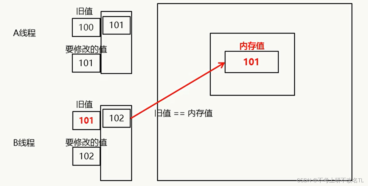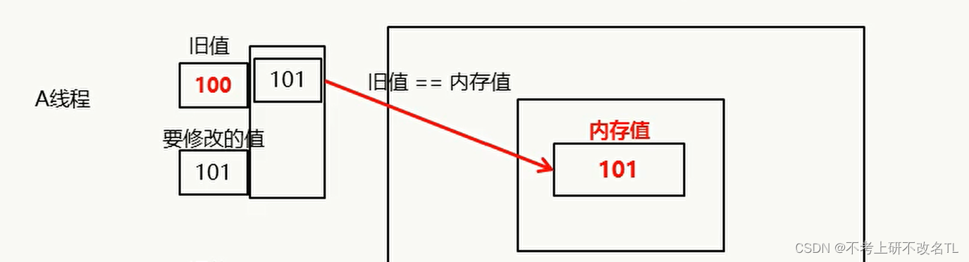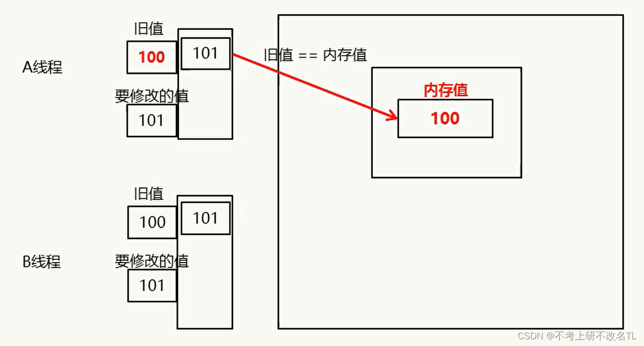 A线程先对比其自身的 (旧值 == 内存值),两者相等,则修改成功,再将需改后的值写回内存,即此时堆内存中的值变为101。