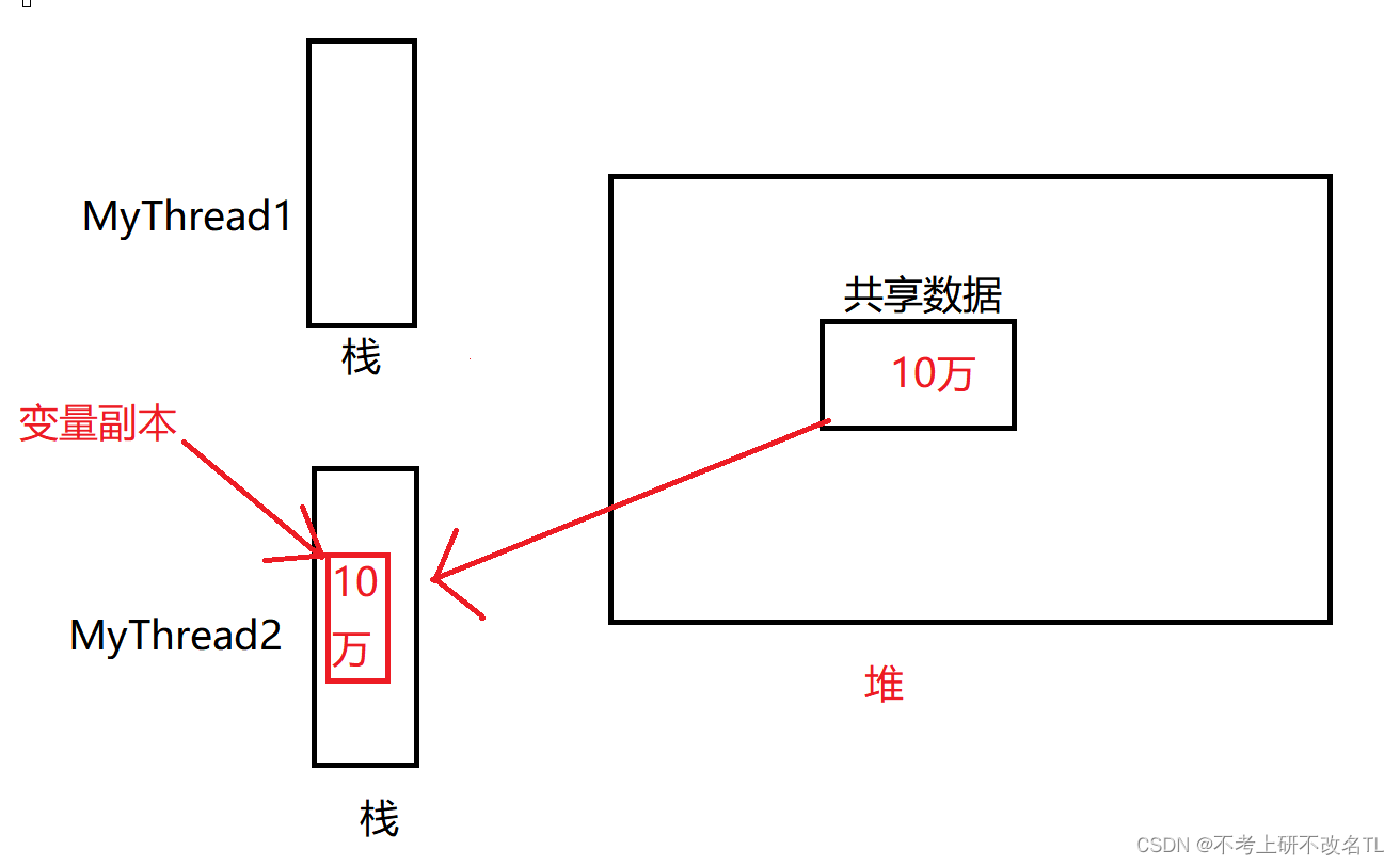 MyThread1 将数值改为9万,再将其推送到堆的共享数据中。而 MyThread2 栈中的数据还是10万,这就导致了上述Bug的发生,当然 MyThread2 中的值也不会一直是10万,其也会定时去访问共享数据,但是什么时候查看是我们无法控制的。