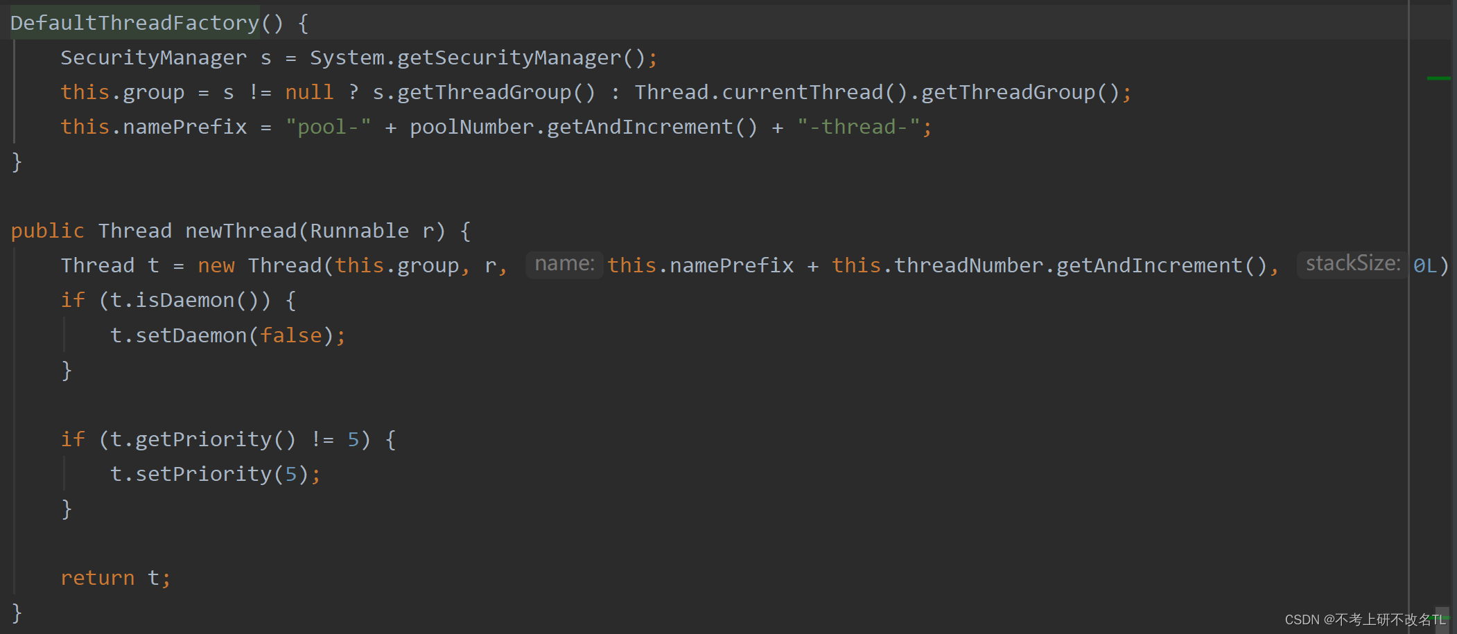 从newThread方法中可以看出,这里也是用之前学的Thread t = new Thread(...),来创建线程,只不过这里设置了一些参数,守护线程,优先级等等......