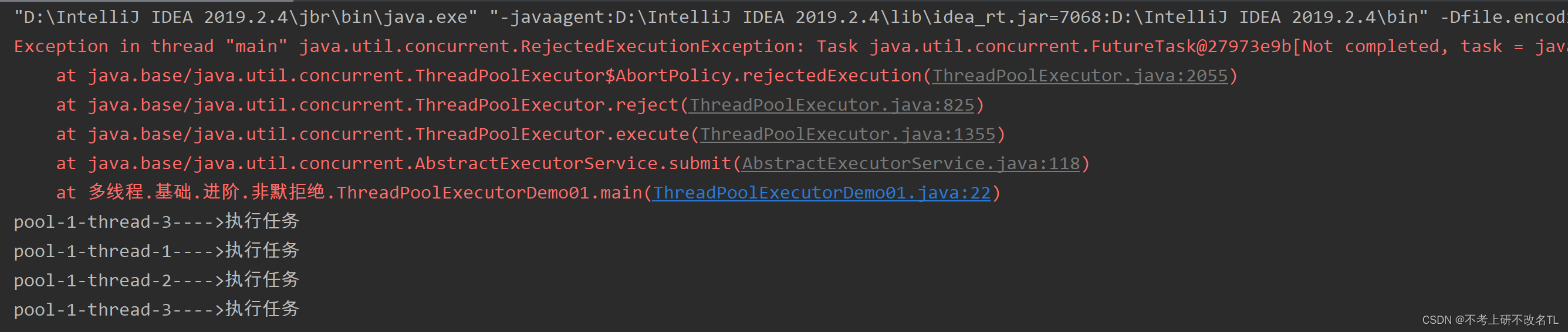上述案例最多可以同时处理4个任务,但是却同时分配了5个任务给他,所以运行抛出RejectedExecutionException异常,并且丢弃最后一个任务。