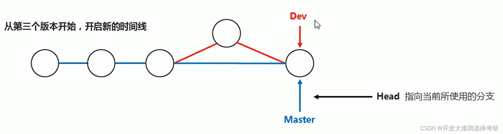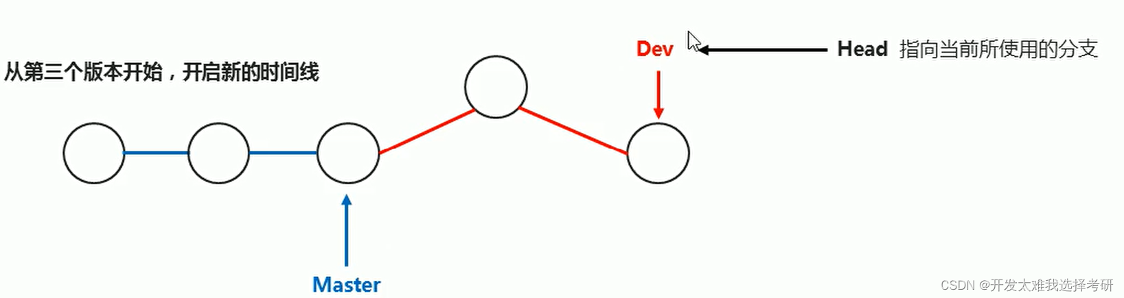 Dev开发完成后,与Master进行合并,head与Master重新指向一起。