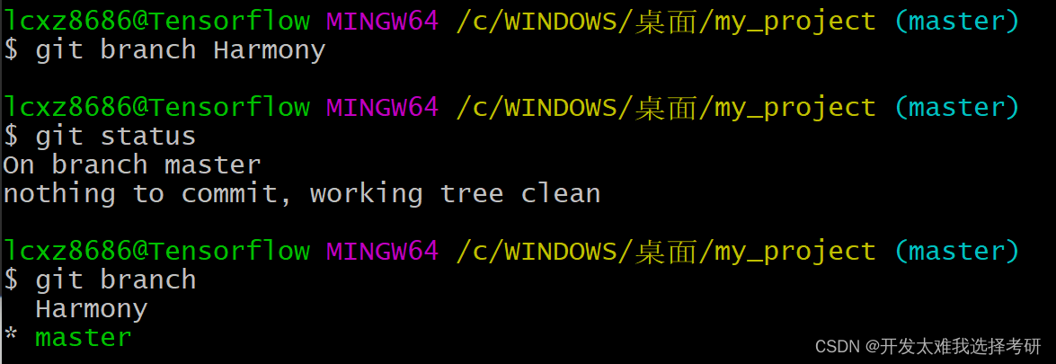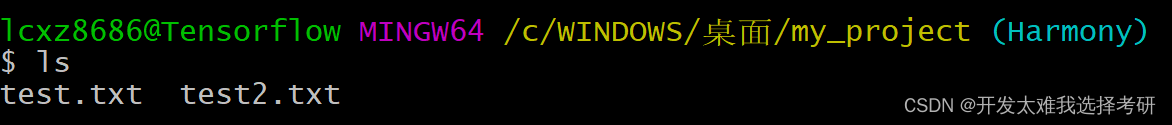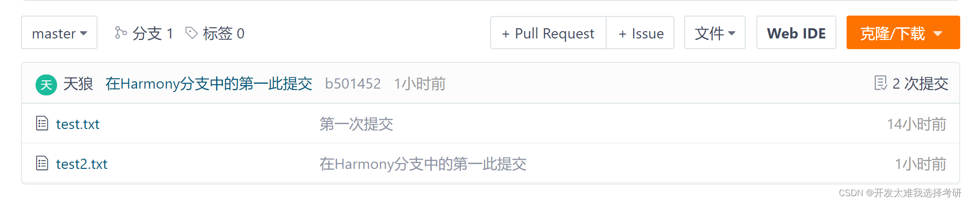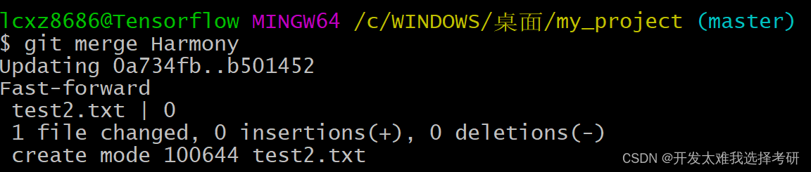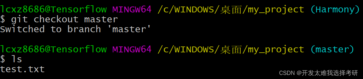 返回master分支,查看是否有在Harmony分支中提交的test2.txt?显然是没有的!