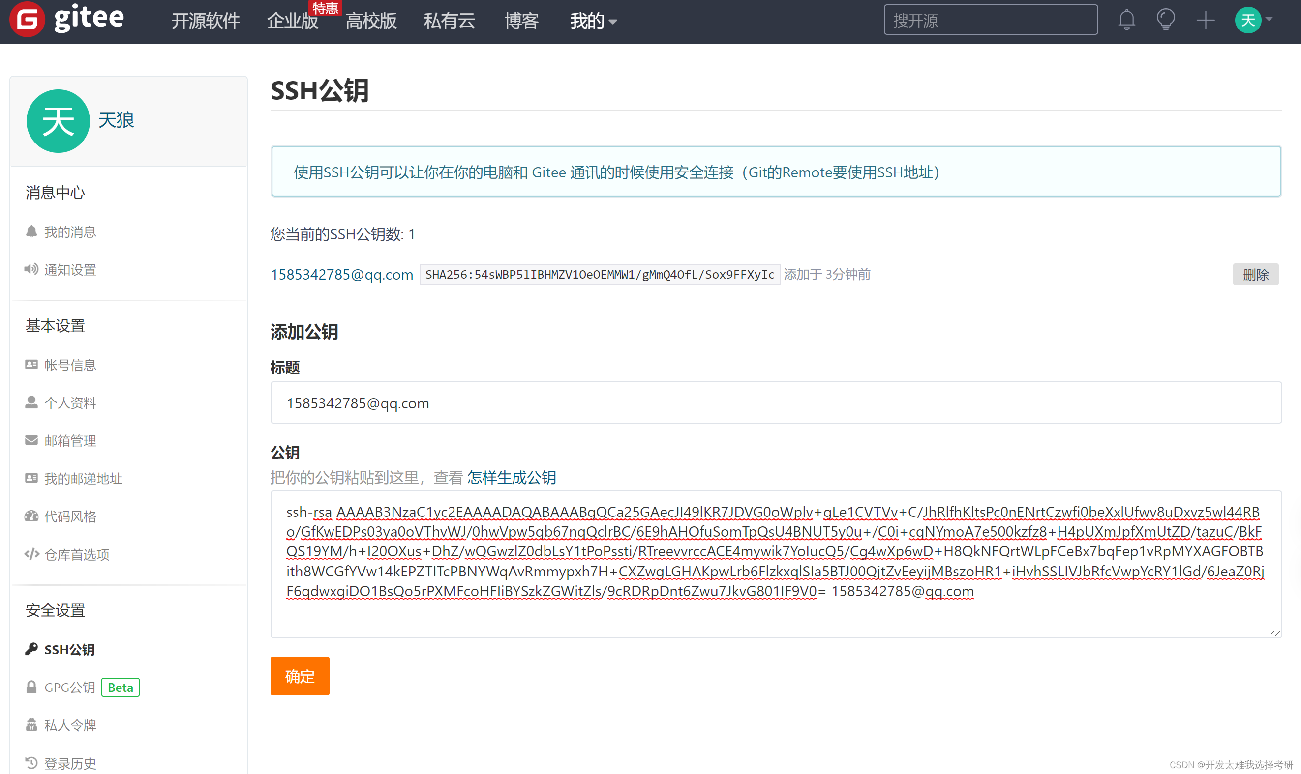 推送代码前,需要先配置一下SSH公钥(必须要做!!!)