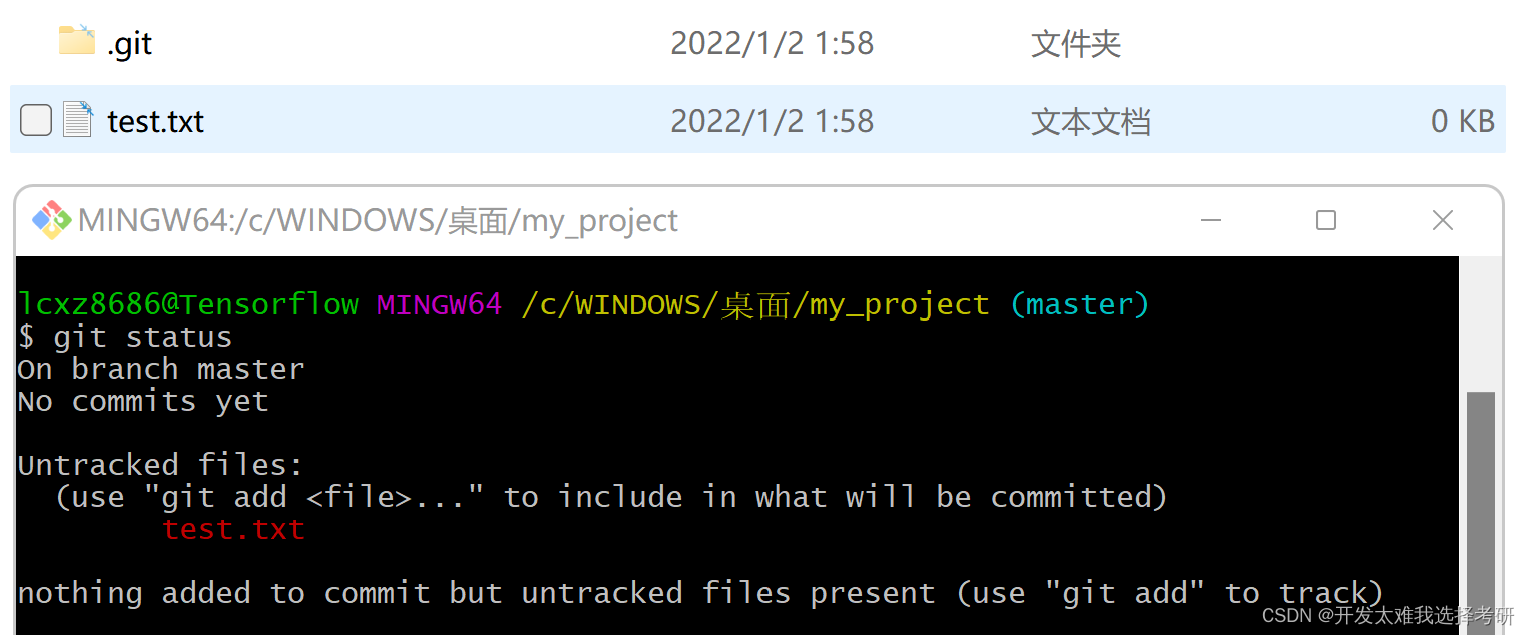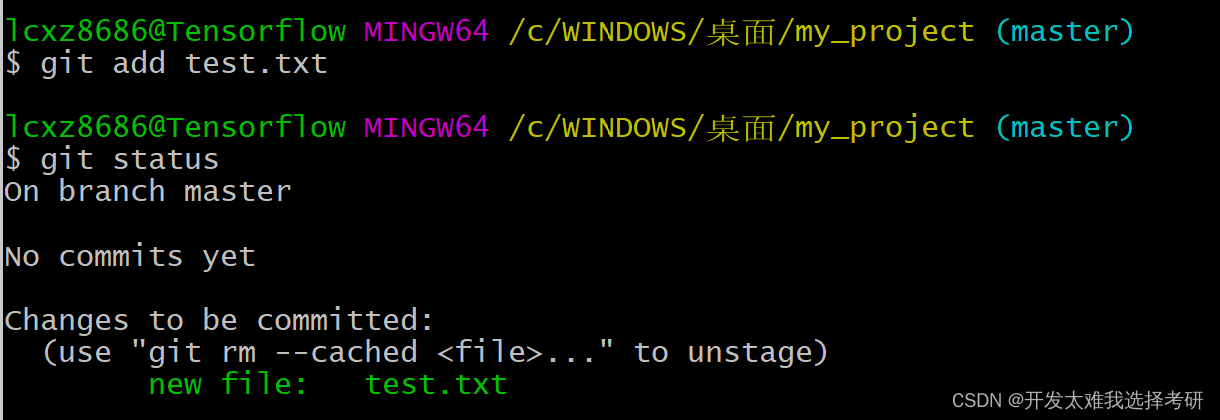 4.进行添加操作,输入:git add test.txt