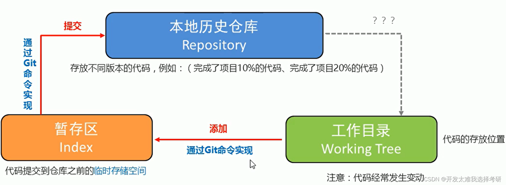 git commit -m "描述信息":提交,将暂存区的文件提交到历史仓库